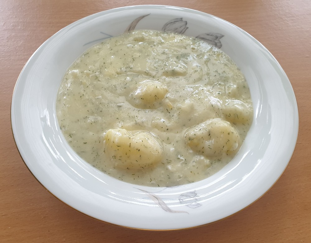 - V mléce rozmícháme polohrubou mouku. Takto připravené mloko s moukou za stálého míchání postupně vléváme do brambor.