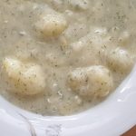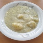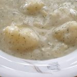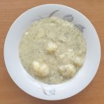 • V mléce rozmícháme polohrubou mouku. Takto připravené mloko s moukou za stálého míchání postupně vléváme do brambor.