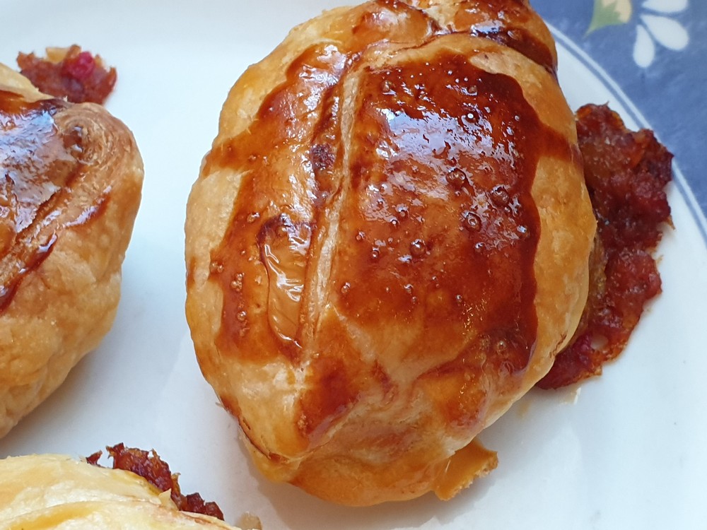 Ingredience: listové těsto pomazánku „Pekelníkovy tousty“ plátkový sýr kečup nebo rajský protlak šunka nebo různé zbytky salámu vejce hladká mouka Postup – taštičky: Listové