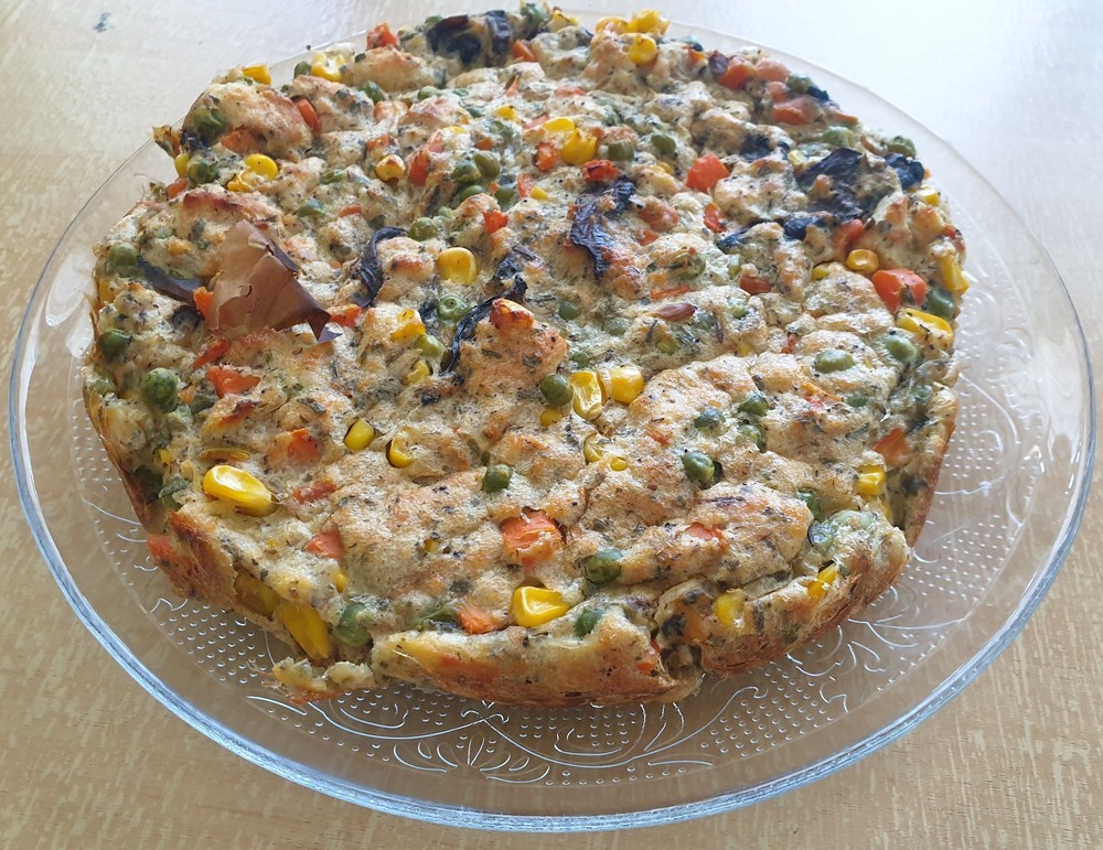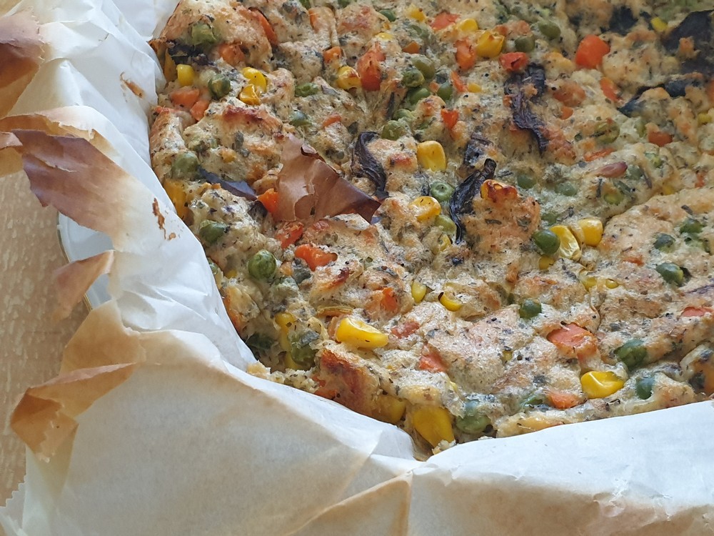 • Celý obsah mísy dáme do pekáčku s pečícím papírem nebo do sádlem vymazaného pekáčku a dáme péct. Hotová nádivka je na okrajích pekáčku zlatá.