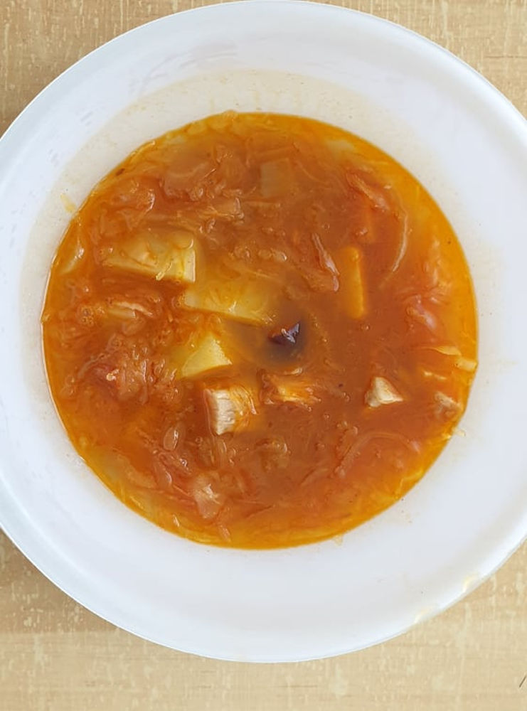 Kousek masa (mohou být i různé druhy) osmahnem. Přidáme zeleninu, danou sklenici boršče a cca. 550 ml vody. Krátce povaříme. Nakonec přidáme trochu kysané smetany