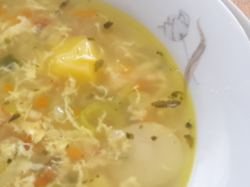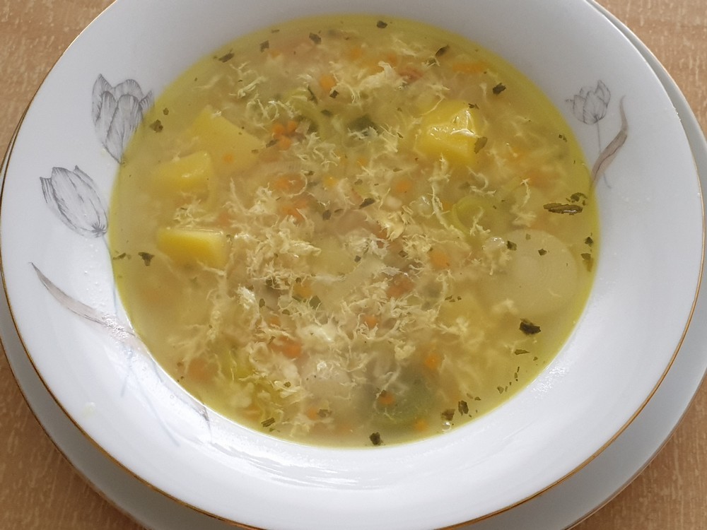 - Do hrnečku rozklepneme vejce, které vidličkou rozšleháme a postupně za mírného míchání vlijeme do polévky.