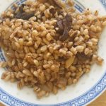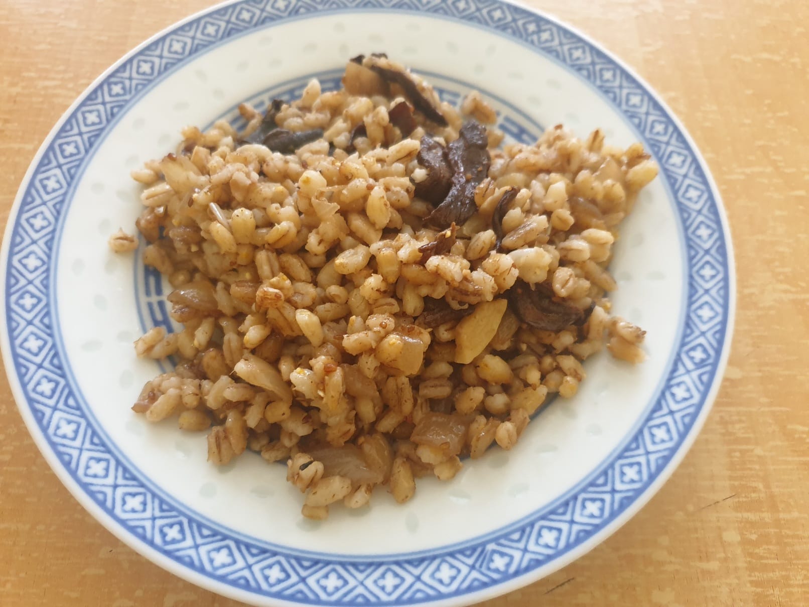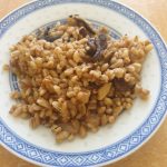 - Do vymaštěného pekáčku nasypeme uvařené kroupy smíchané s houbami.