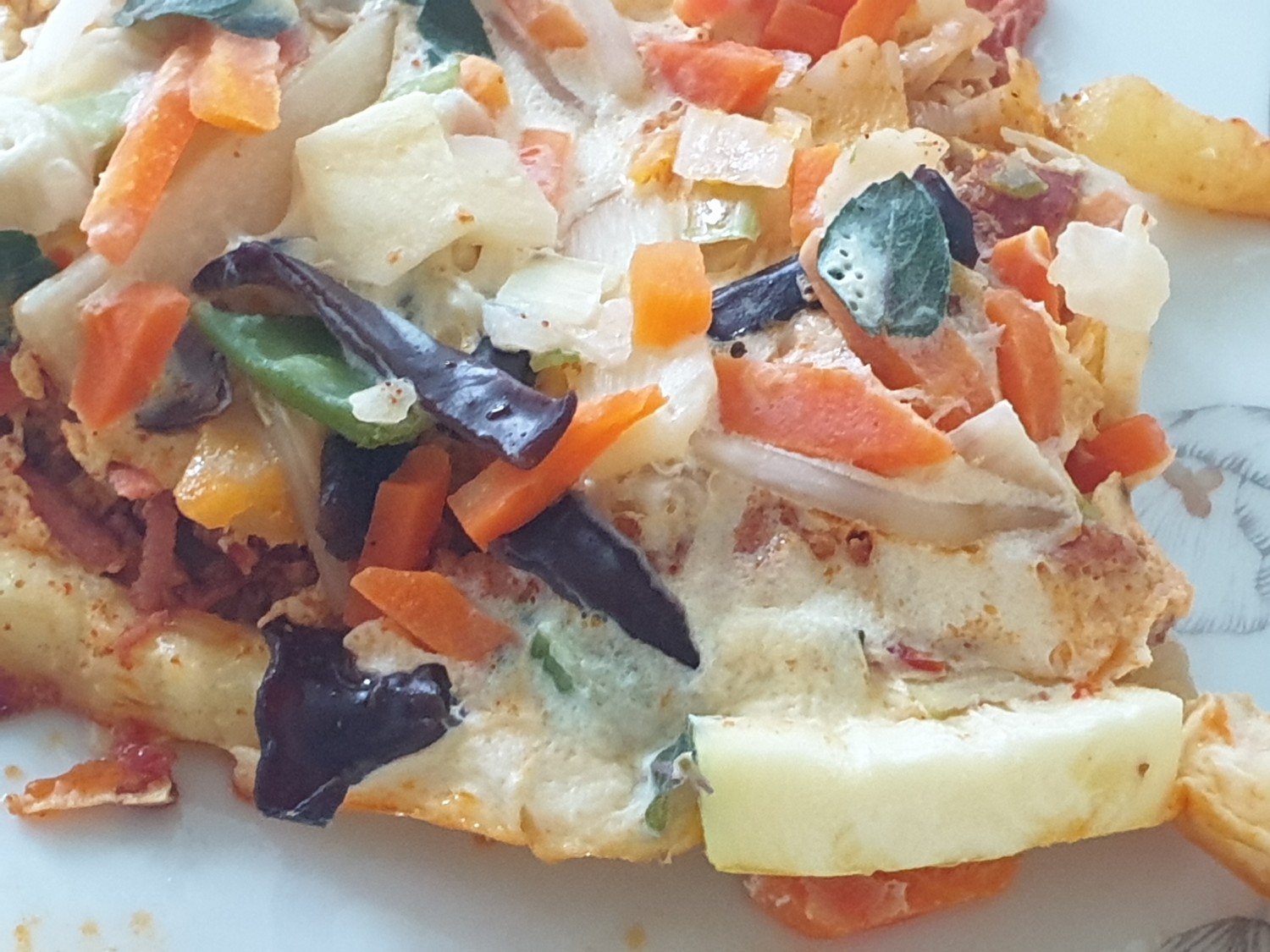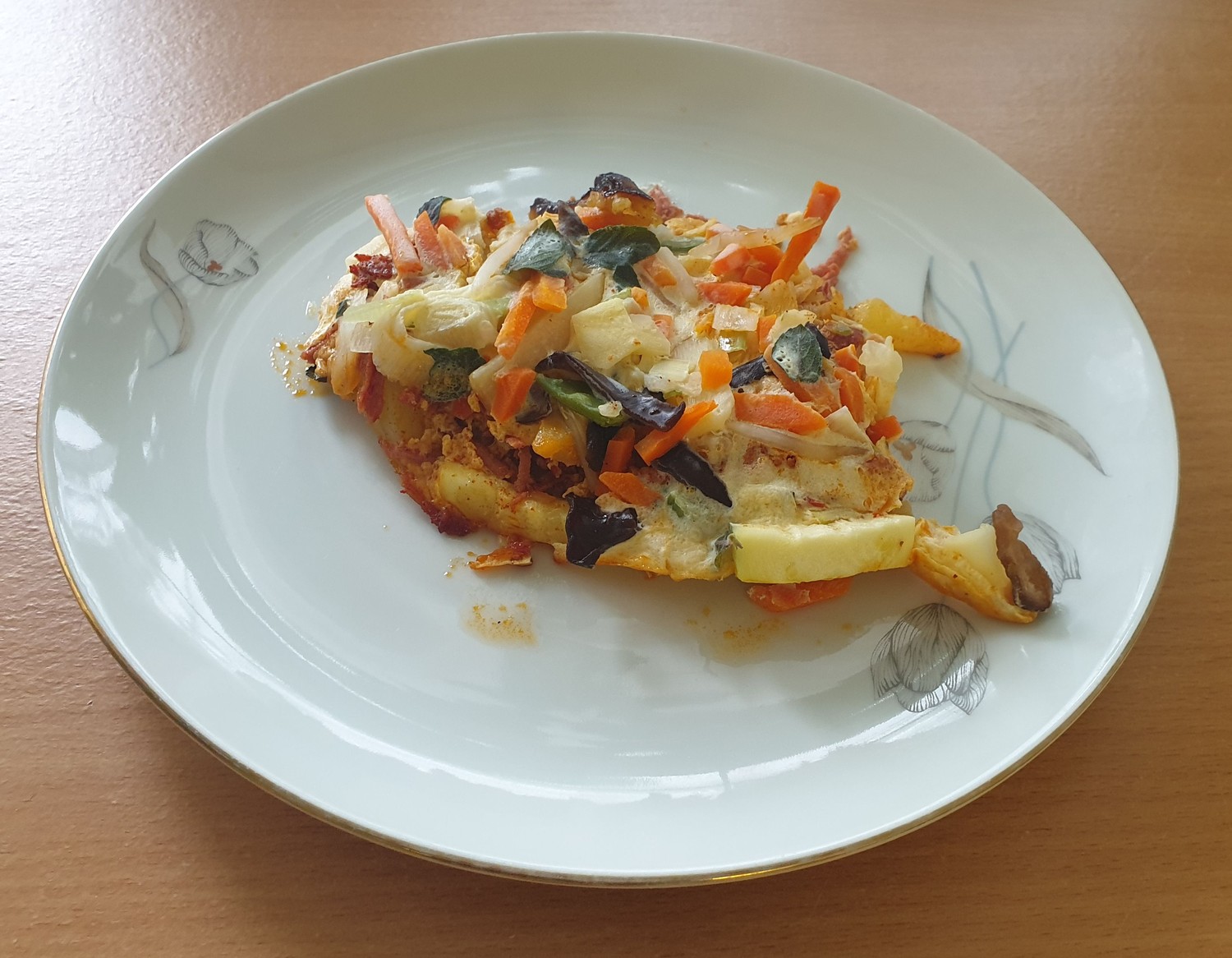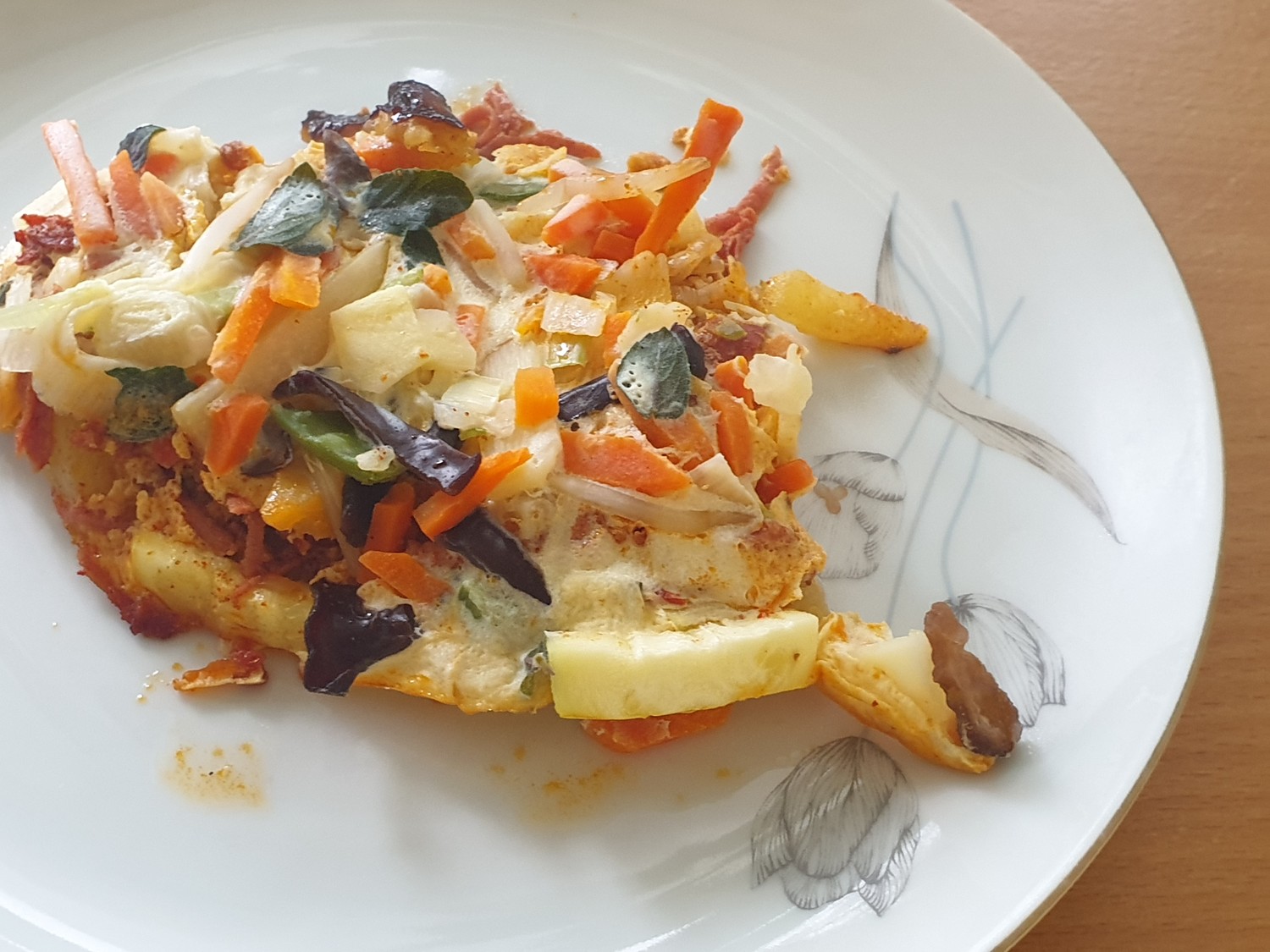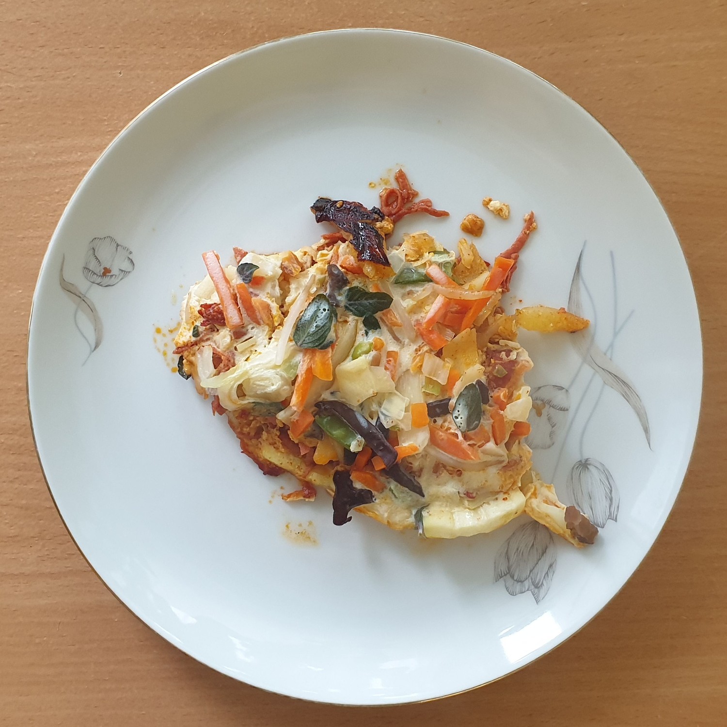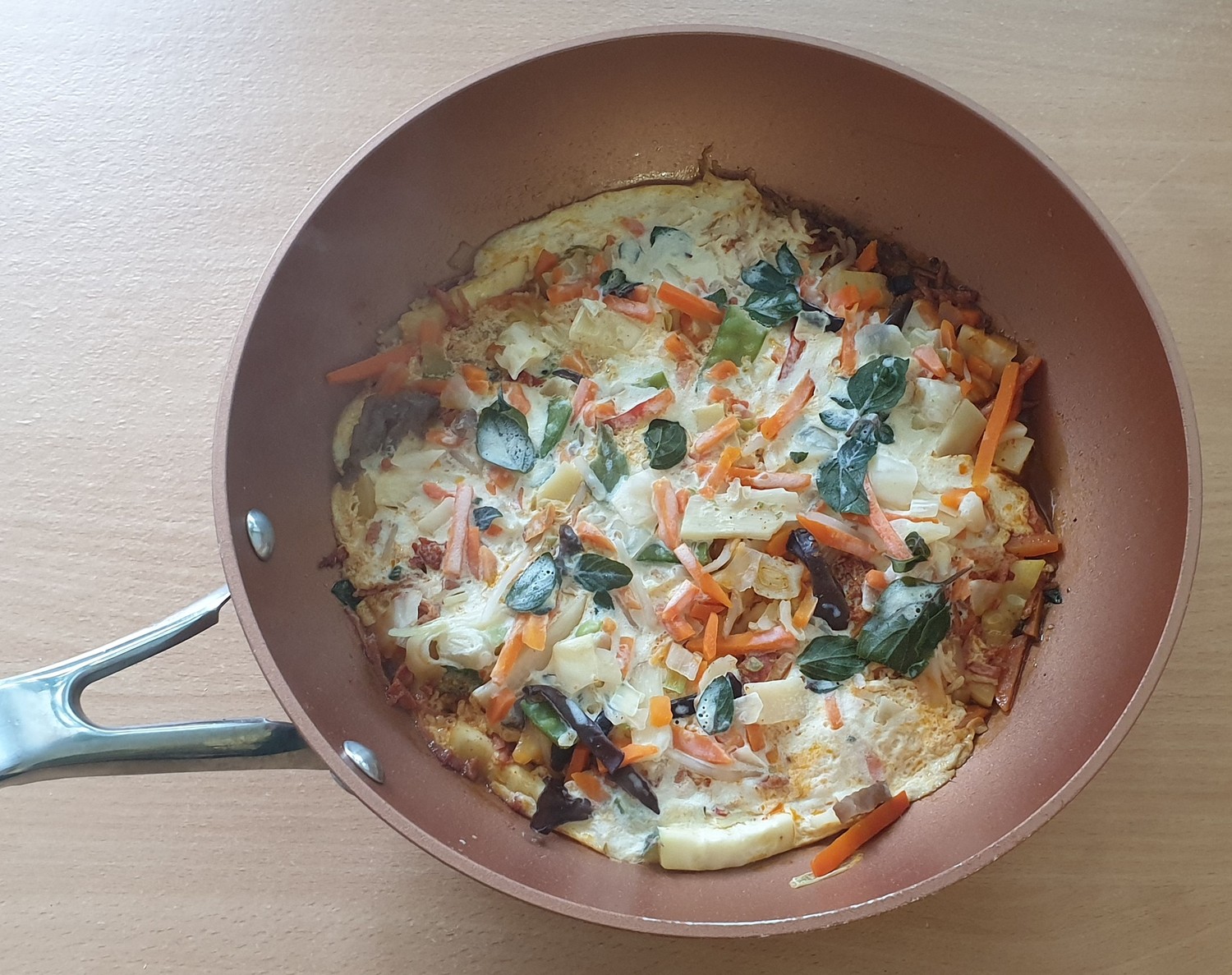 - Rozšleháme vejce s trochou smetany, soli a bazalkou a zalijeme jimi pánev.